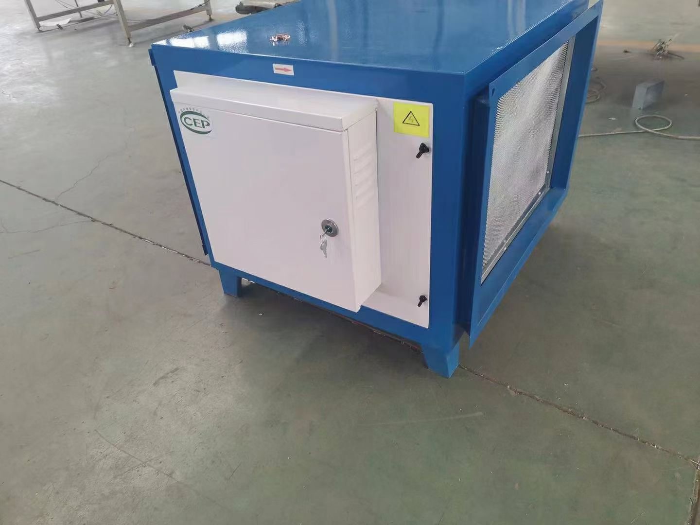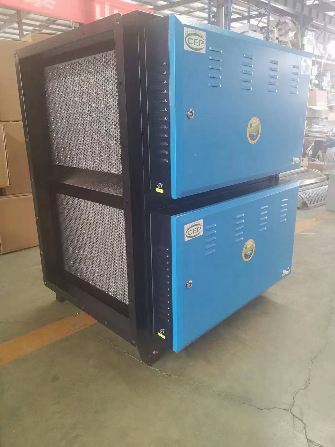 2、高效過濾消聲段:經(jīng)過前端處理后,去除了大部分油煙,而逃逸的微米級油煙氣被后置的高效過濾段(粗過濾和精過濾)處理后大部分被過濾,余下的亞微米級的油霧微粒和煙氣中有毒有害物質(zhì)及異味等進(jìn)入低溫等離子體凈化段處理。